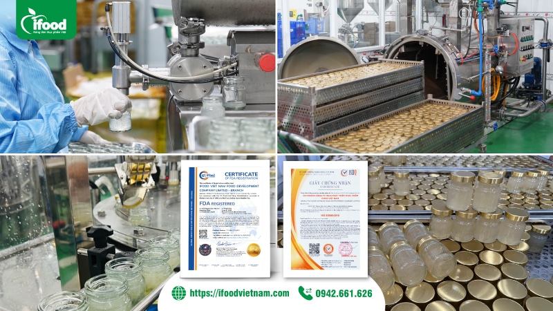 Nhà máy sản xuất yến hũ chưng sẵn IFood Việt Nam với quy trình kiểm soát chất lượng nghiêm ngặt theo tiêu chuẩn của an toàn thực phẩm và ISO, đạt các chứng nhận ISO 22000:2018 cho ngành nghề sản xuất yến hũ chưng sẵn và các sản phẩm từ yến sào, đạt chứng nhận FDA của Hoa Kỳ.